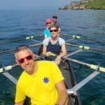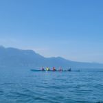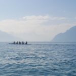 Nous sommes 15 à embarquer dans nos 3 yolettes pour finalement une sortie traditionnelle de 10 km contre le vent jusqu’au Vinorama. Le temps est doux et quelques vagues nous bercent.