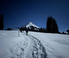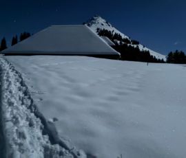 Après environ 1h30 de marche, c’est la récompense de tous les efforts : la buvette est accueillante et chaleureuse. On peut y déguster les délicieux plats du terroir fribourgeois cuisinés avec du fromage fabriqué sur place durant l’été : macaronis du chalet, fondue, croûte au fromage, mais aussi röstis, côtelette/jambon ou assiette froide ! Et pour les desserts, la tarte au vin cuit et le café glacé nappé de double crème sont un régal !La descente se fait à pied le long du chemin ou en luge à travers le pâturage pour autant que les conditions d’enneigement le permettent (location de luges/bobs sur place).