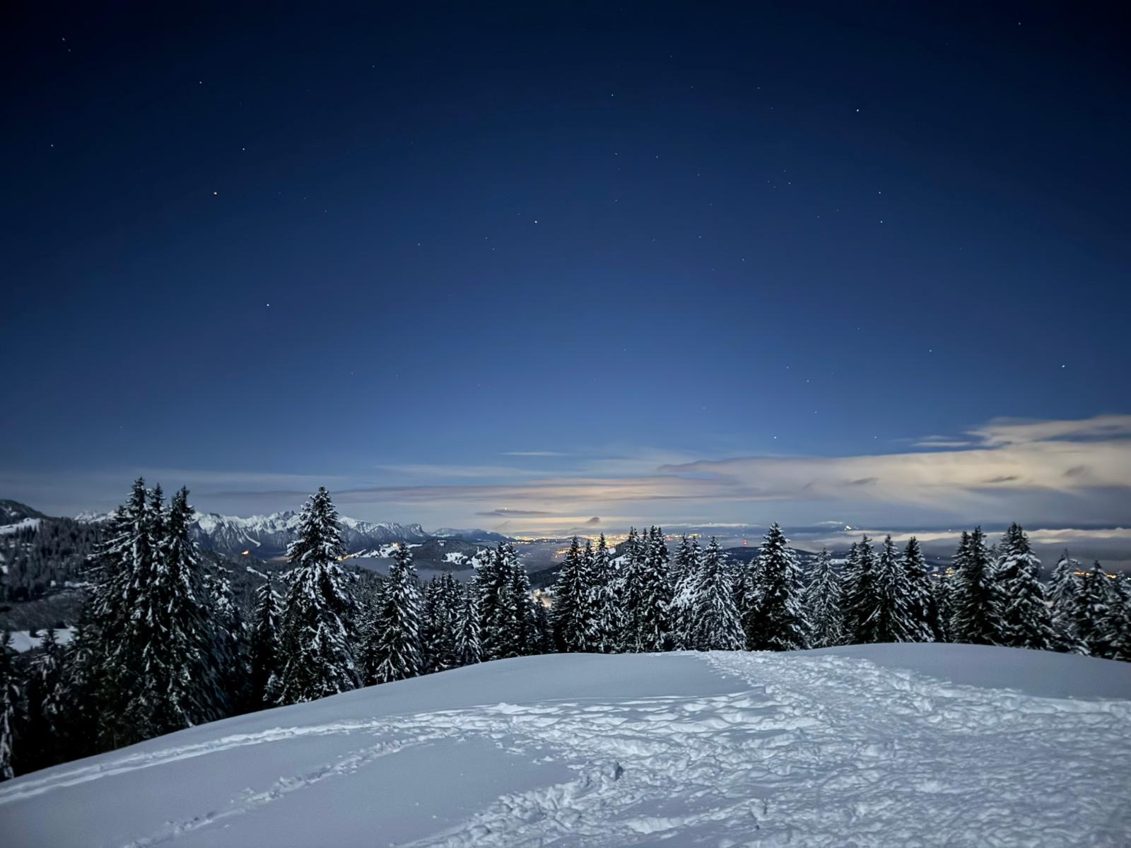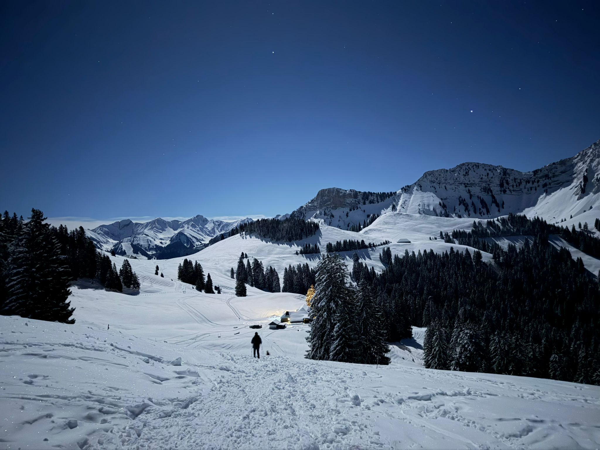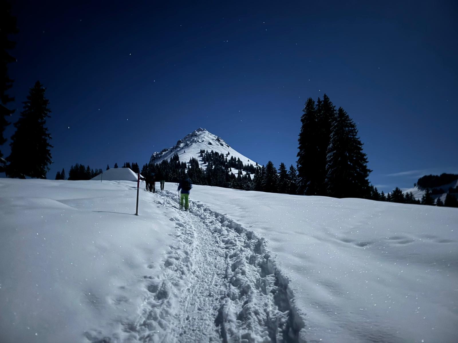 La montée est techniquement facile mais le sentier qui serpente à travers la forêt est raide (430 mètres de dénivelé). Alors on parle peu, on écoute les sons de la forêt, on guette les chamois qui se laisseraient surprendre, on lève les yeux vers le ciel étoilé à la recherche de la Grande Ourse ou d’Orion, et on admire, à l’approche du sommet, la majestueuse Dent de Lys.