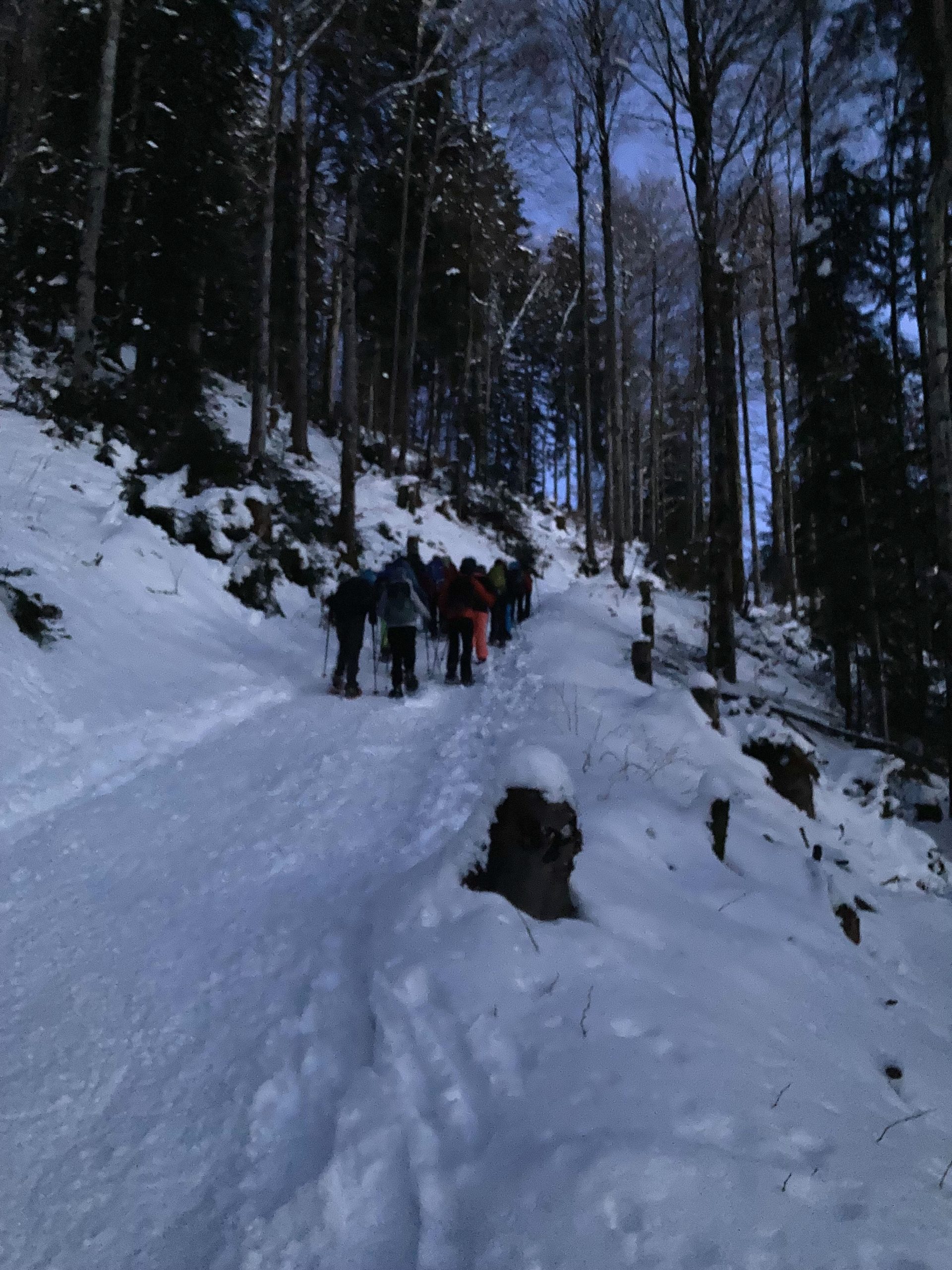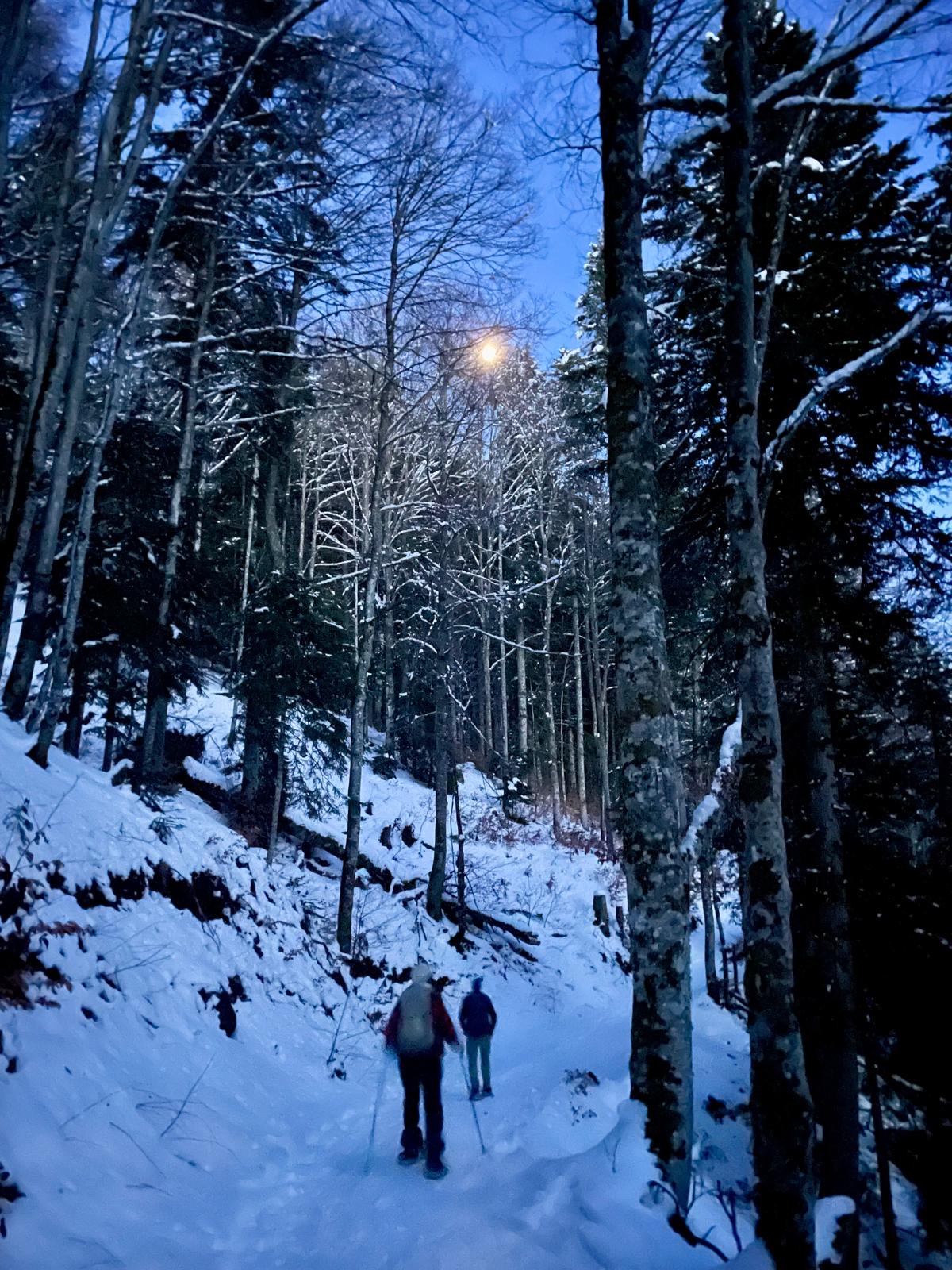 Le moment venu de la descente, les intrépides optèrent pour les joies de la vitesse en bob, les autres pour une marche méditative, les yeux rivés au ciel et les pieds bien ancrés dans la neige fraîche, quelques raquettes ayant rendu l’âme !