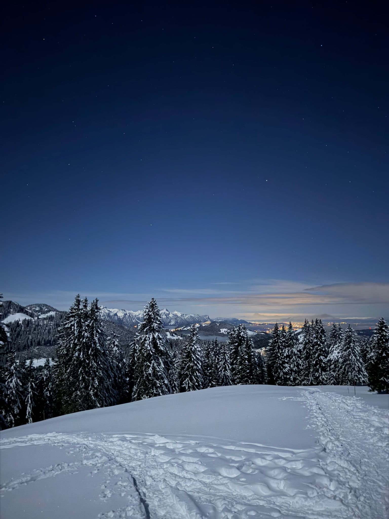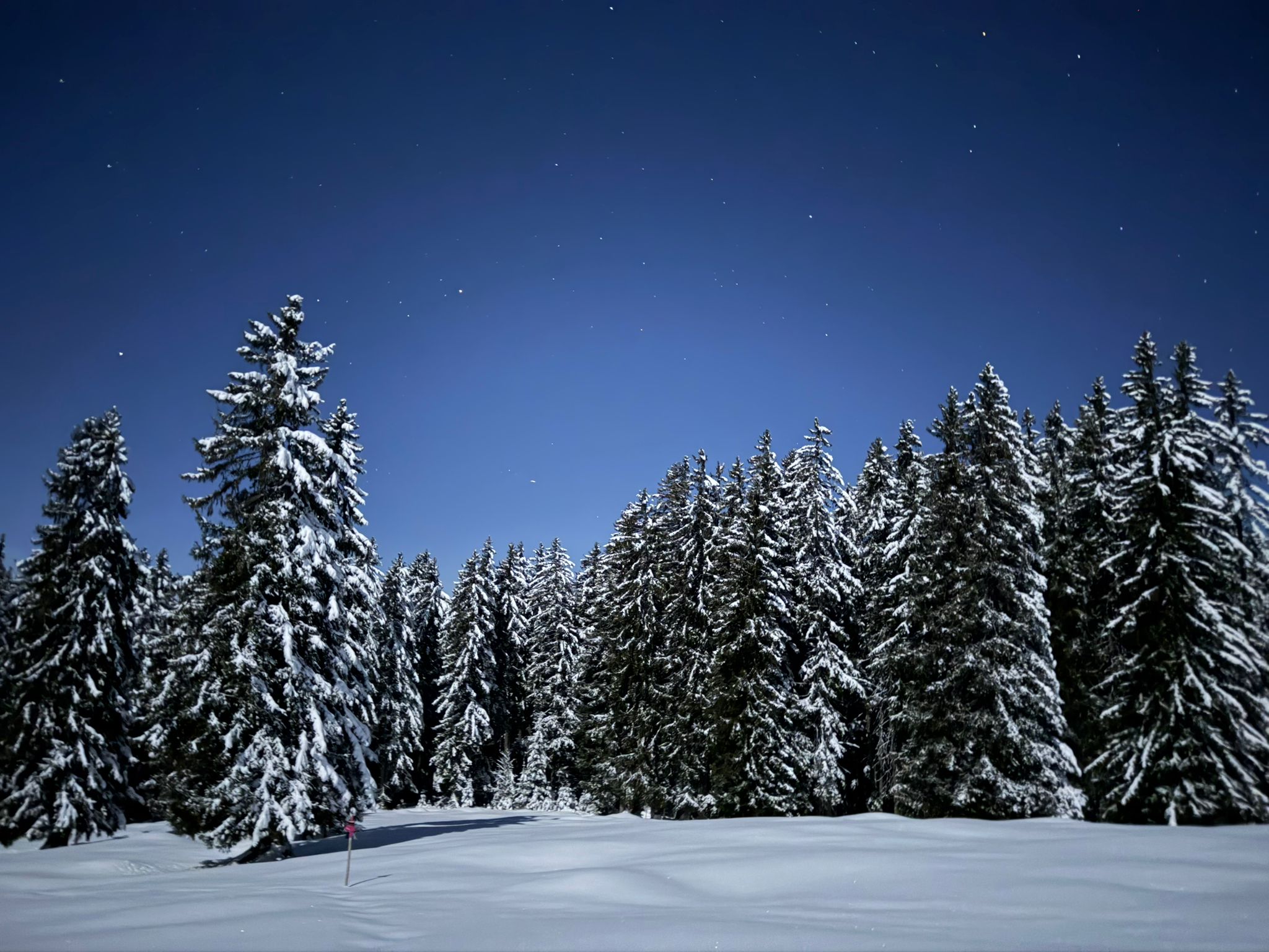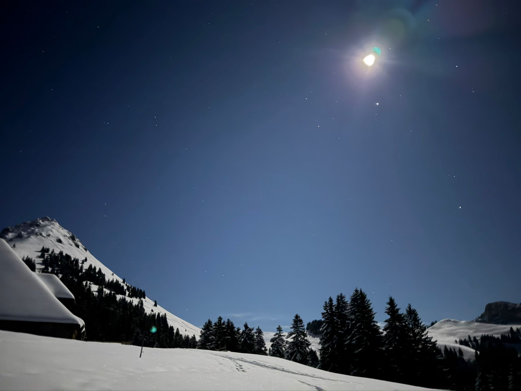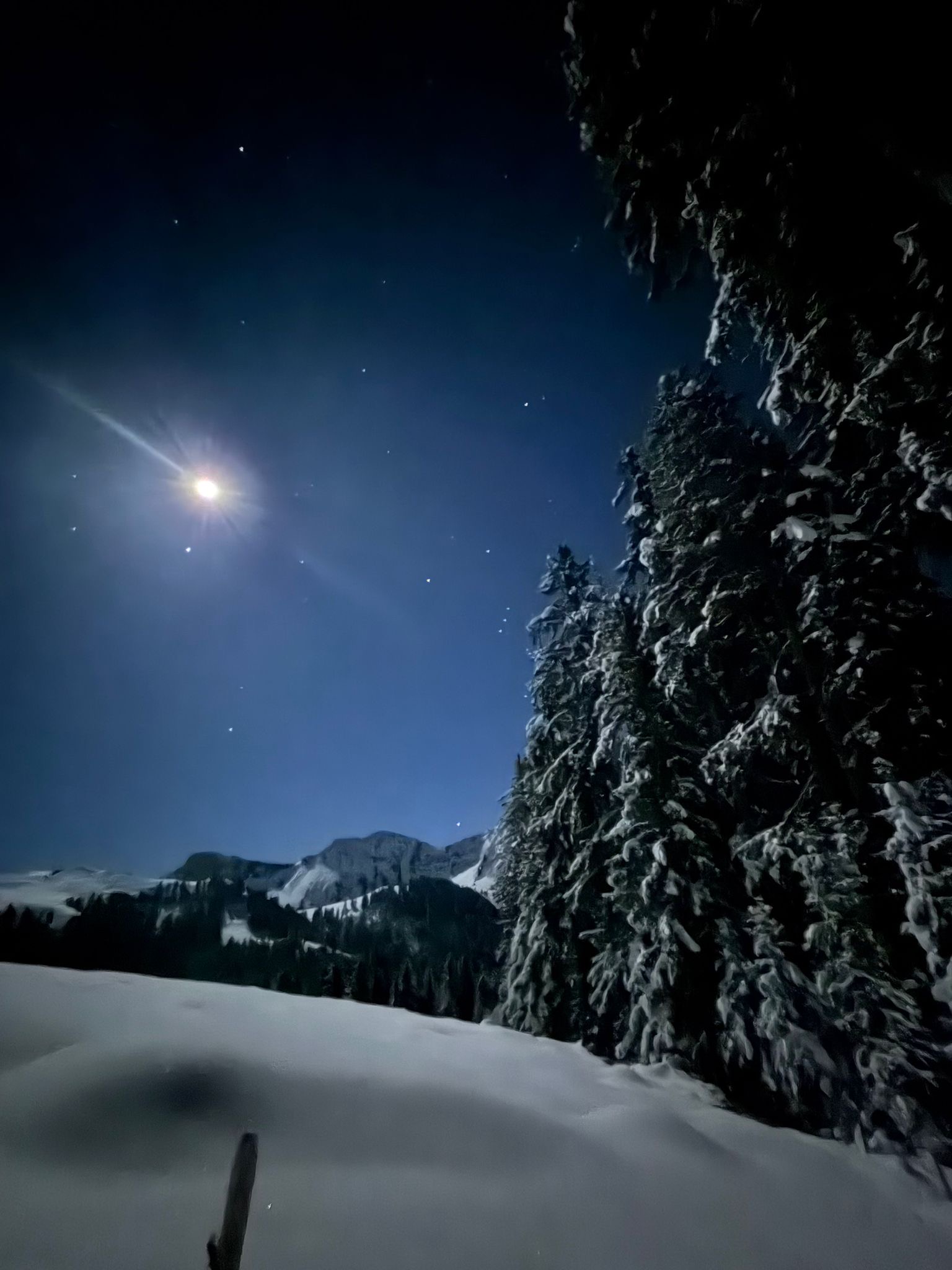 La nature n’a pas sa pareille pour nous surprendre, c’est fabuleux ! Car si la neige était attendue, le clair de lune et le ciel étoilé l’étaient bien moins.