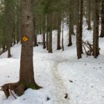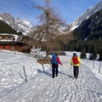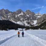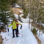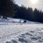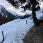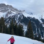 Sur une solide et large route jusqu’à Solalex, nous avons entamé le flanc de coteau qui nous ramenait direction sud par un sentier rendu cahoteux par la température clémente et la multitude de marcheurs. Puis la traversée de la forêt et du couloir a discipliné les pas sur une seule trace plus plane et régulière. Mais l’absence de neige sur une portion de parcours nous conduisit sur une forte pente que nous franchissions en zig zag.