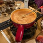 Au chaud, une agréable musique remplaça le bruissement des branches et nous nous mîmes rapidement d’accord sur la fondue aux tomates. En attendant d’attaquer les premiers coups de fourchette, c’est un excellent gamay vielles trucs (vignes) qui éveilla nos papilles. De fil en aiguille, les jolies petites patates rondes et les morceaux de pain portèrent la fondue au firmament. Elle était fameuse et moelleuse à souhait. La bonne humeur et la sérénité étaient aussi de la partie. Ponctuée par un dessert tout aussi délectable et ses cafés, nous envisageâmes la descente.