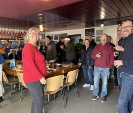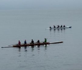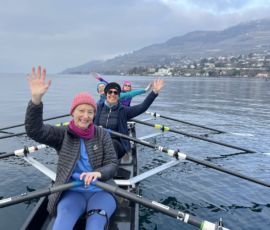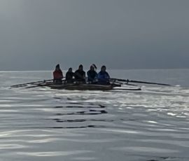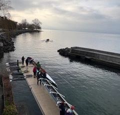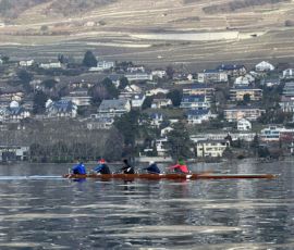 Dimanche 21 décembre, jour du solstice d’hiver, 29 rameurs motivés par un beau lac plat s’embarquent sur les 3 yolettes, le Saxo et notre vénérable Janie. Sous un timide soleil, parfois même dans une brume enivrante et en chanson pour certains, top départ direction Rivaz.