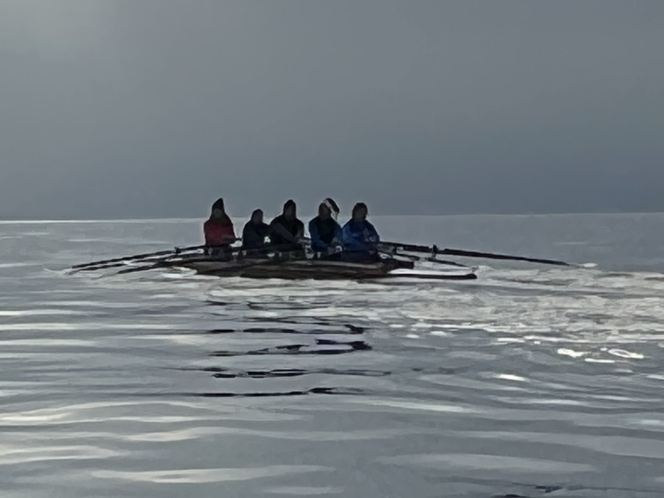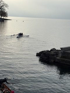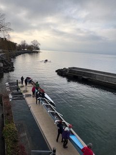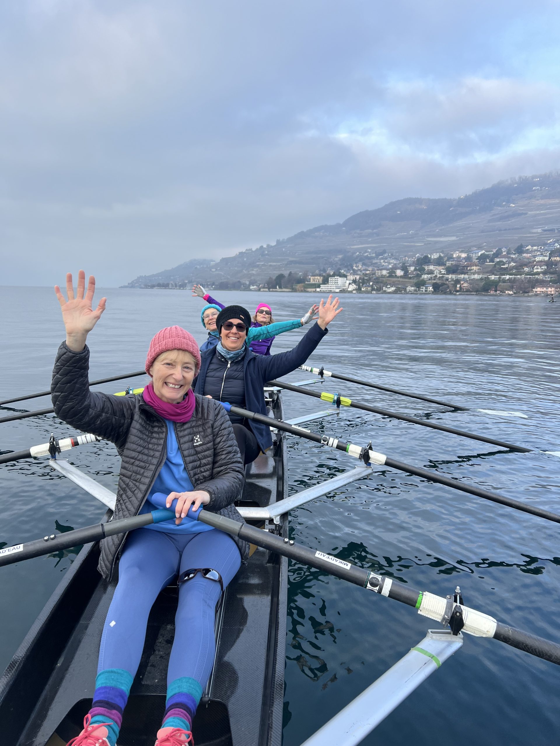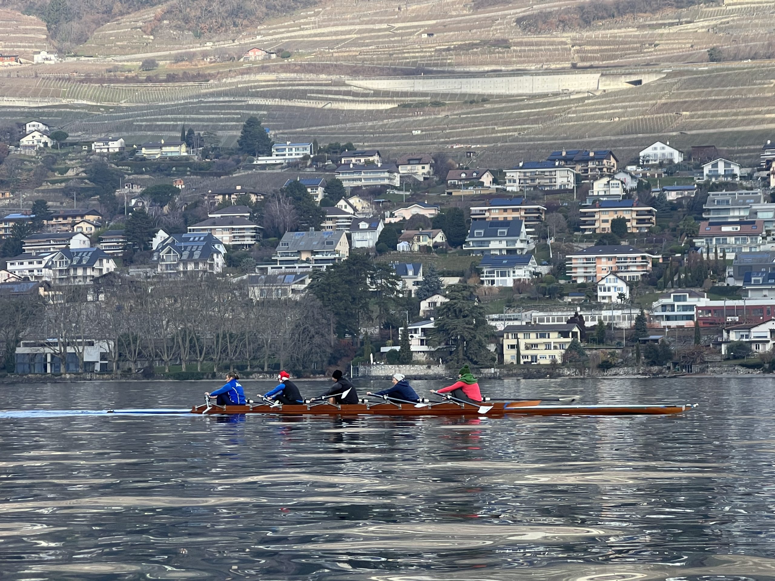 Dimanche 21 décembre, jour du solstice d’hiver, 29 rameurs motivés par un beau lac plat s’embarquent sur les 3 yolettes, le Saxo et notre vénérable Janie. Sous un timide soleil, parfois même dans une brume enivrante et en chanson pour certains, top départ direction Rivaz.