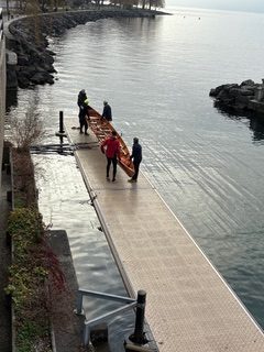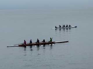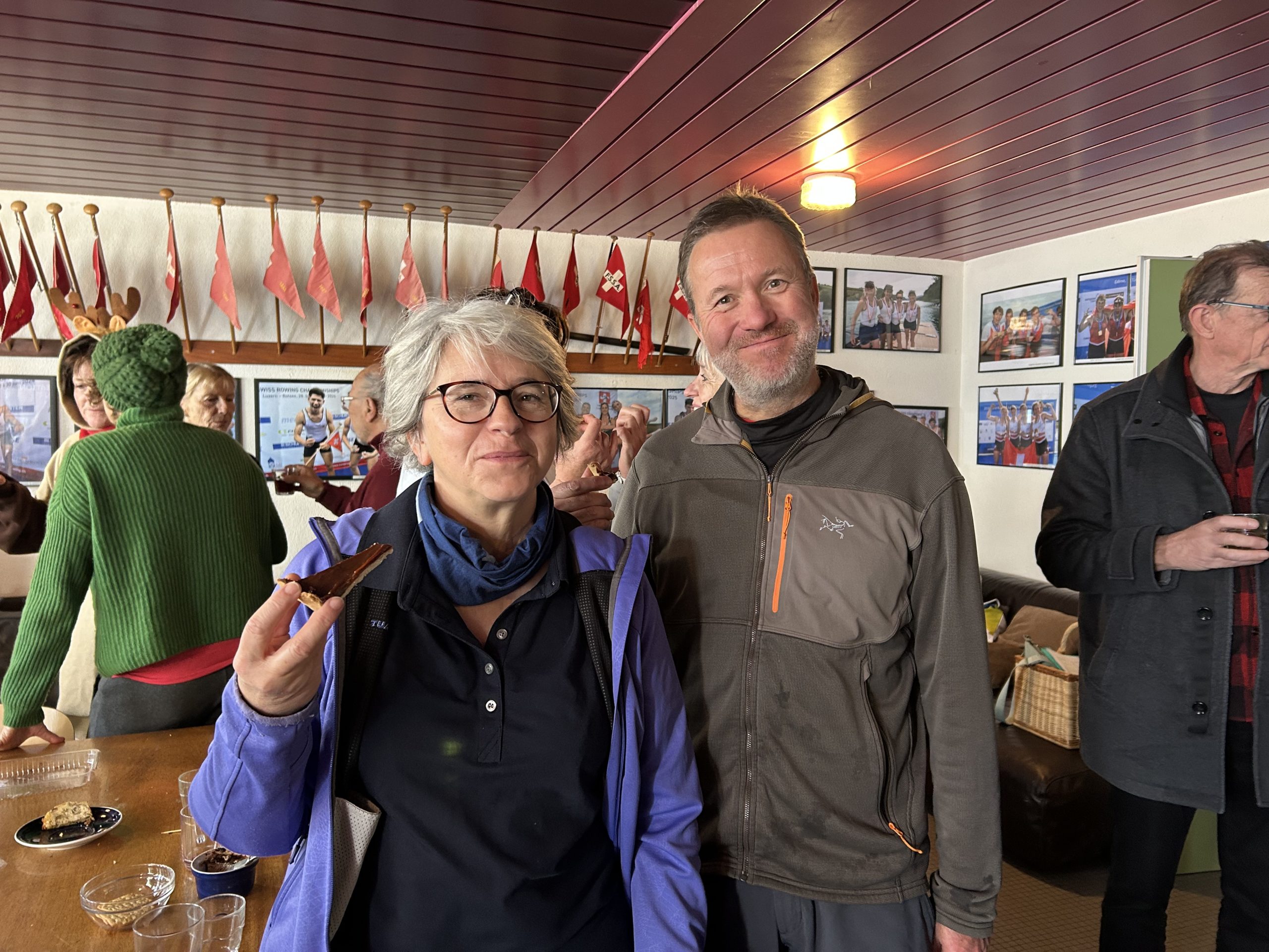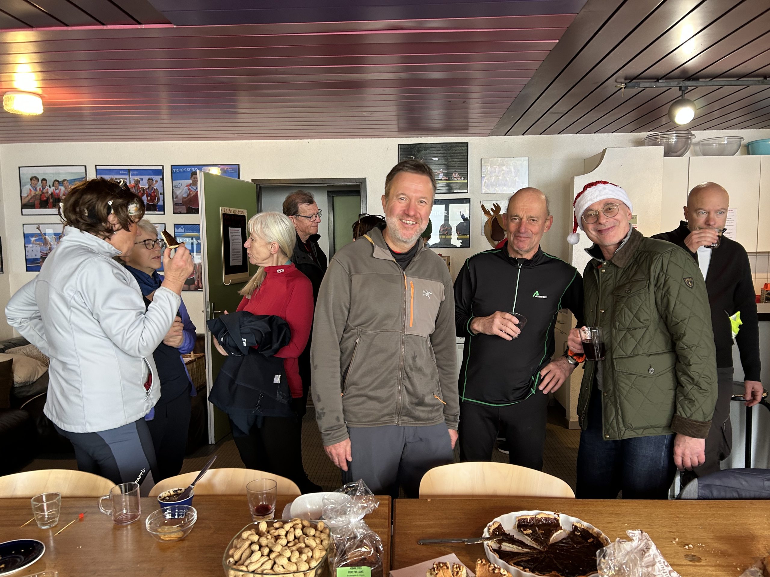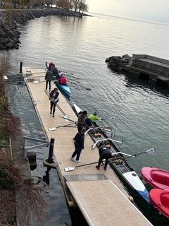 Dimanche 21 décembre, jour du solstice d’hiver, 29 rameurs motivés par un beau lac plat s’embarquent sur les 3 yolettes, le Saxo et notre vénérable Janie. Sous un timide soleil, parfois même dans une brume enivrante et en chanson pour certains, top départ direction Rivaz.