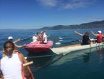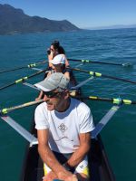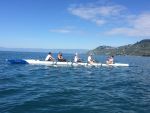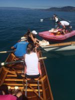 Plusieurs d’entre nous n’avaient jamais accosté avec un aviron… qui plus est sans ponton. L’accostage comme l’embarquement furent de grands moments. Il s’agit d’assurer le bateau, le maintenir, le délester de ses rames, aider les rameurs à se hisser hors de l’embarcation, sortir le bateau et tout cela sur un magnifique tapis d’algues glissantes à souhait. Toutes ces manœuvres ont eu lieu devant une dizaine de personnes, avachies sur leur chaise-longue regardant le spectacle et faisant des pronostics quant au 1er qui se rétamerait. Étrangement, après nos grandes manœuvres, il n’y avait plus personne sur les transats.