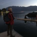 Il nous faut rentrer, verres aux fonds du bateau. La consigne est de rester au bord… mais pas trop près à cause des cailloux. La notion de bord étant relative, chacun y va comme il peut. Au loin soudain des feux, une fumée lumineuse. Qui s’éteint. Puis se rallume. Les suppositions fusent : Leysin? le Kuklos? C’est étrange quand même. On le saura à l’arrivée, il s’agissait des lumières de L’Hongrin.Plus aucun arrêt jusqu’au CAV, comme une sortie régulière les bateaux glissent sans bruits sur l’eau jusqu’au ponton. Rangement. Salutations. Rires. Apéros. Discussions. Au revoirs. Il est temps de rendre à la nature son calme sur l’eau et d’observer de loin la lune se refléter sur la surface calme du lac.